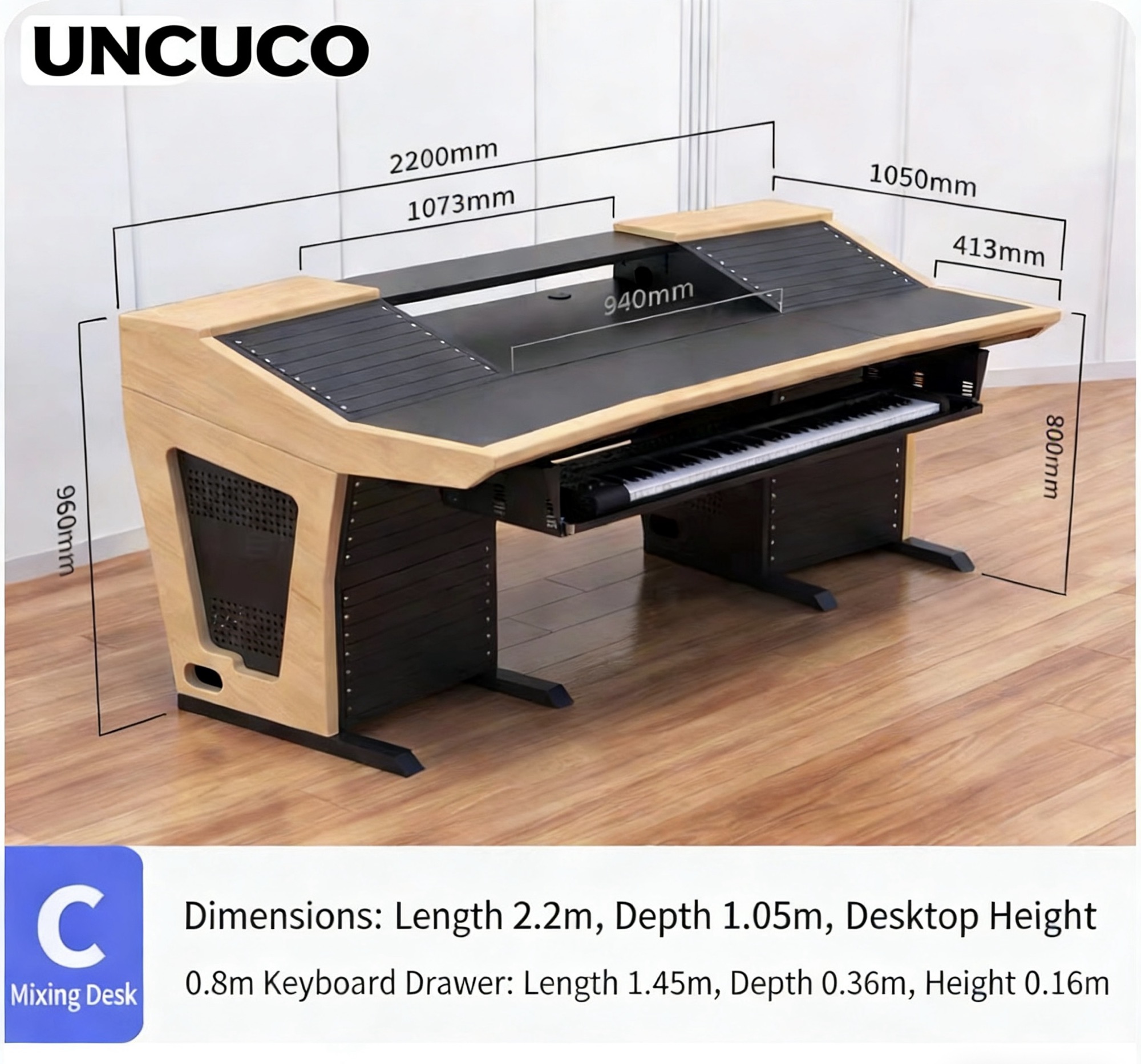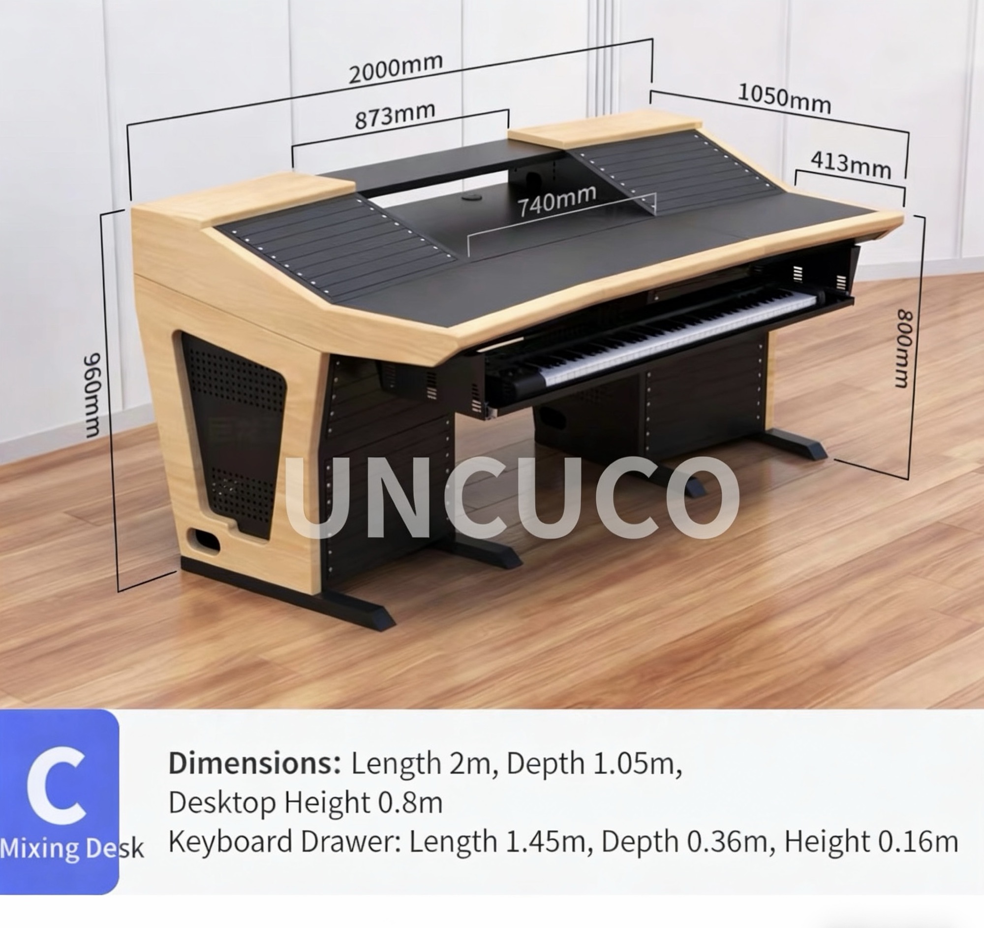 • 2.0m × 1.05m: Compact UNCUCO home music production desk, ideal for spare rooms, home offices, and small podcast studios; fits dual monitors and a compact mixing console with ease.