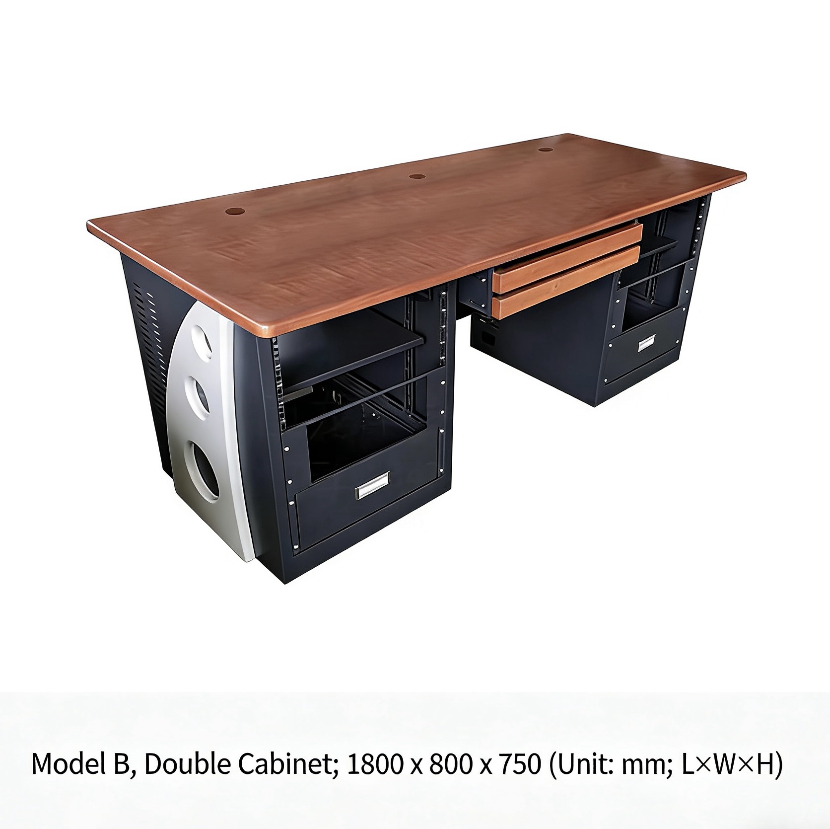 Our most popular model is the 1.8m (1800×800×750mm) editing console, designed for 2–3 users with dual 19-inch racks. We also offer fully custom sizes, from compact single-user stations to large multi-rack broadcast desks.